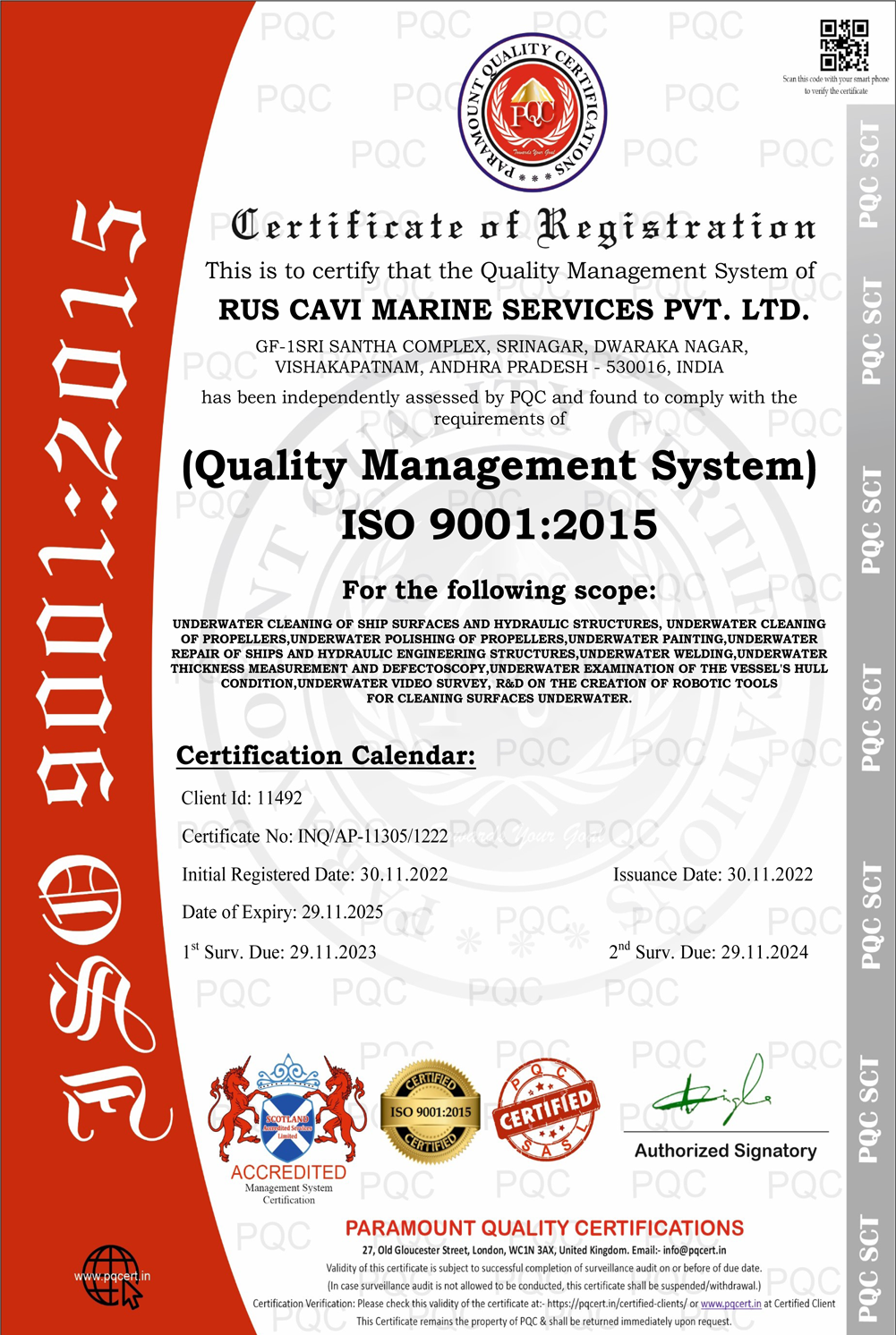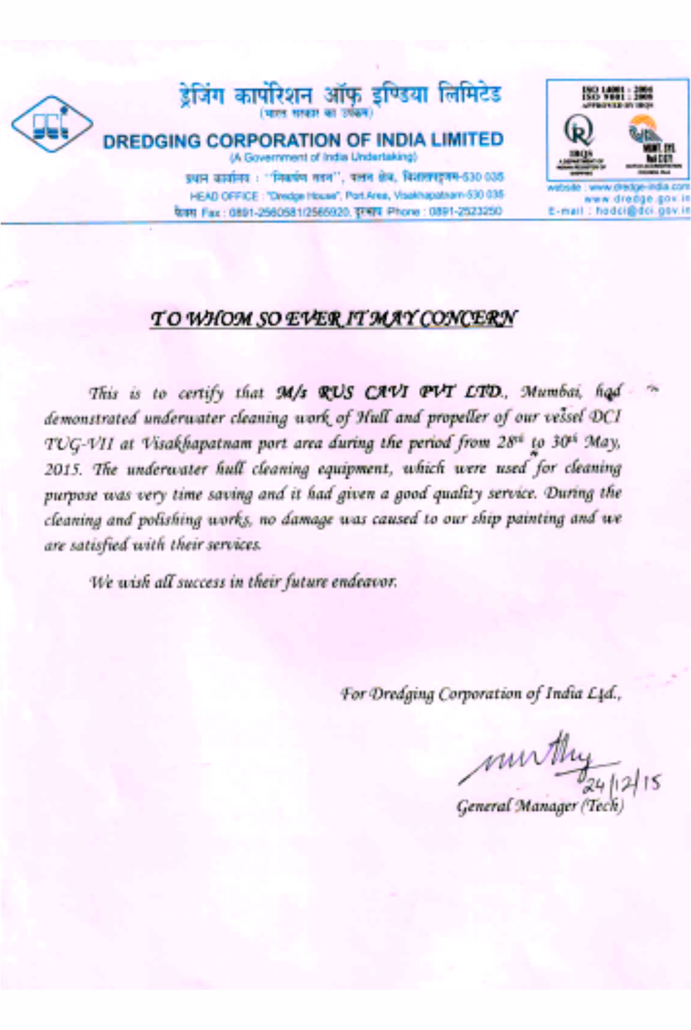 RUS CAVI MARINE SERVICES PRIVATE LIMITED which has been in the business of providing Under water services like hull cleaning, polishing of properellors, video graphy of vessels, Oxy-Arc Gas Cutting ,Arc Welding, Salvage Survey, De-sitting, Pipe Laying, Hydro & Thermal Power Stations maintenance jobs, Photography and Dam Site Works and all kinds of under water Services based at Vizag and all our India, to large business organization for convenient price. We execute works to the utmost satisfaction of our Clients.