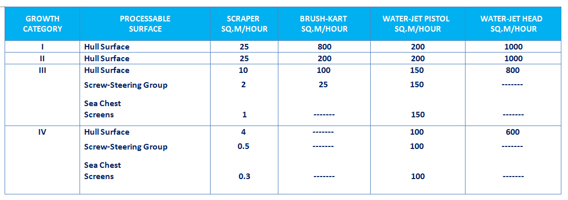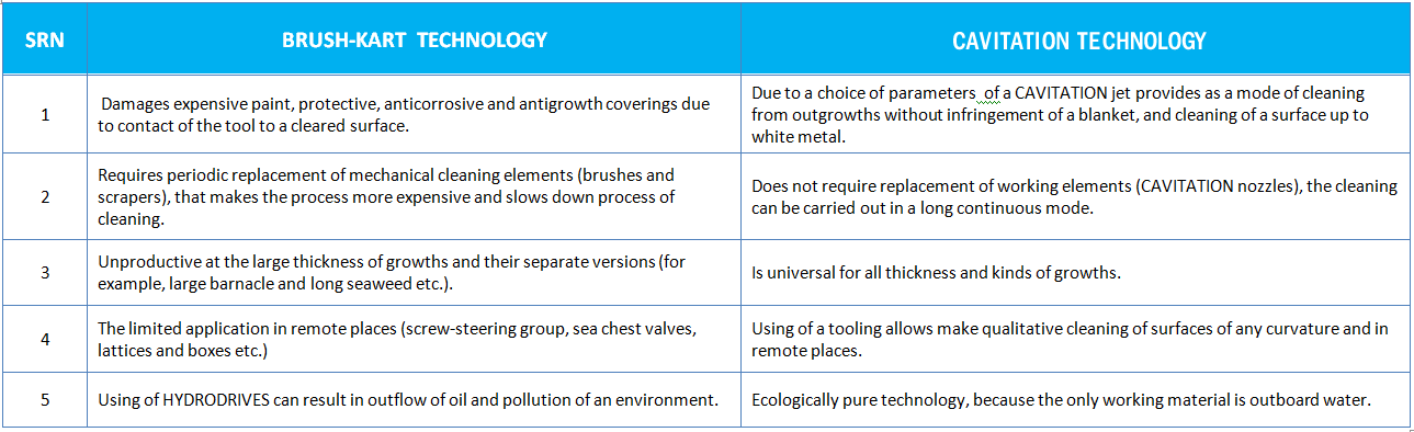 This work is carried out by the divers with the help of scrapers or mechanical brushes ("BRUSH-KART" technology) with the productivity of cleaning from 5 up to 800 sq.m per hour at the cost of cleaning up to USD 15 per 1 sq.m of a vessel's underwater surface. The given speed and cost restrictions of mechanical cleaning are explained by the fact that the divers scrape and beat off growths coat by coat, because at the large thickness they stick together with each other reaching the concrete durability. Besides due to the contact of the tools with a cleansed surface expensive protective anticorrosive coverings could be damaged.